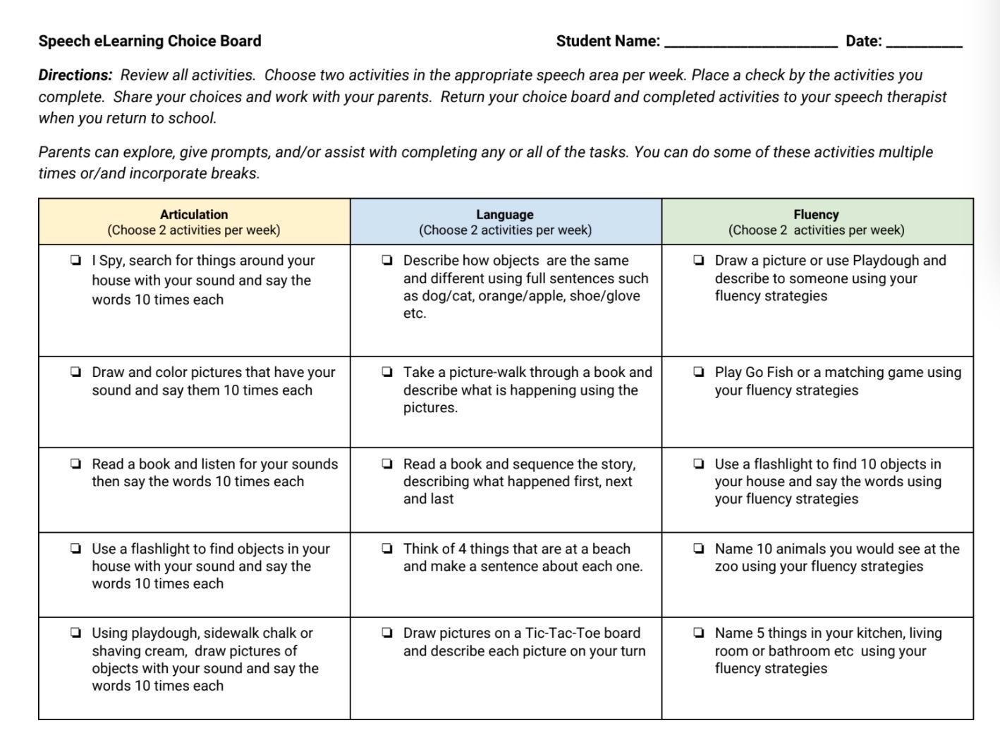 - Speech-Language Therapy Weekly Activities: Please refer to this schedule so that you may have speech & language activities to use over the next 2 weeks.